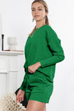 - The set features a long sleeve top and matching shorts, both made from a textured fabric in a chic color.